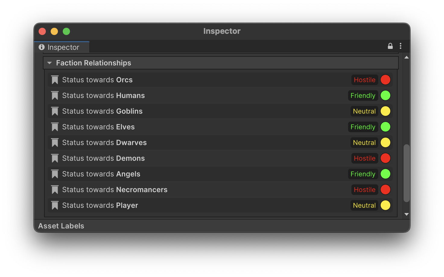 The **Faction** asset has several distinct sections, each allowing you to configure different aspects of the faction.