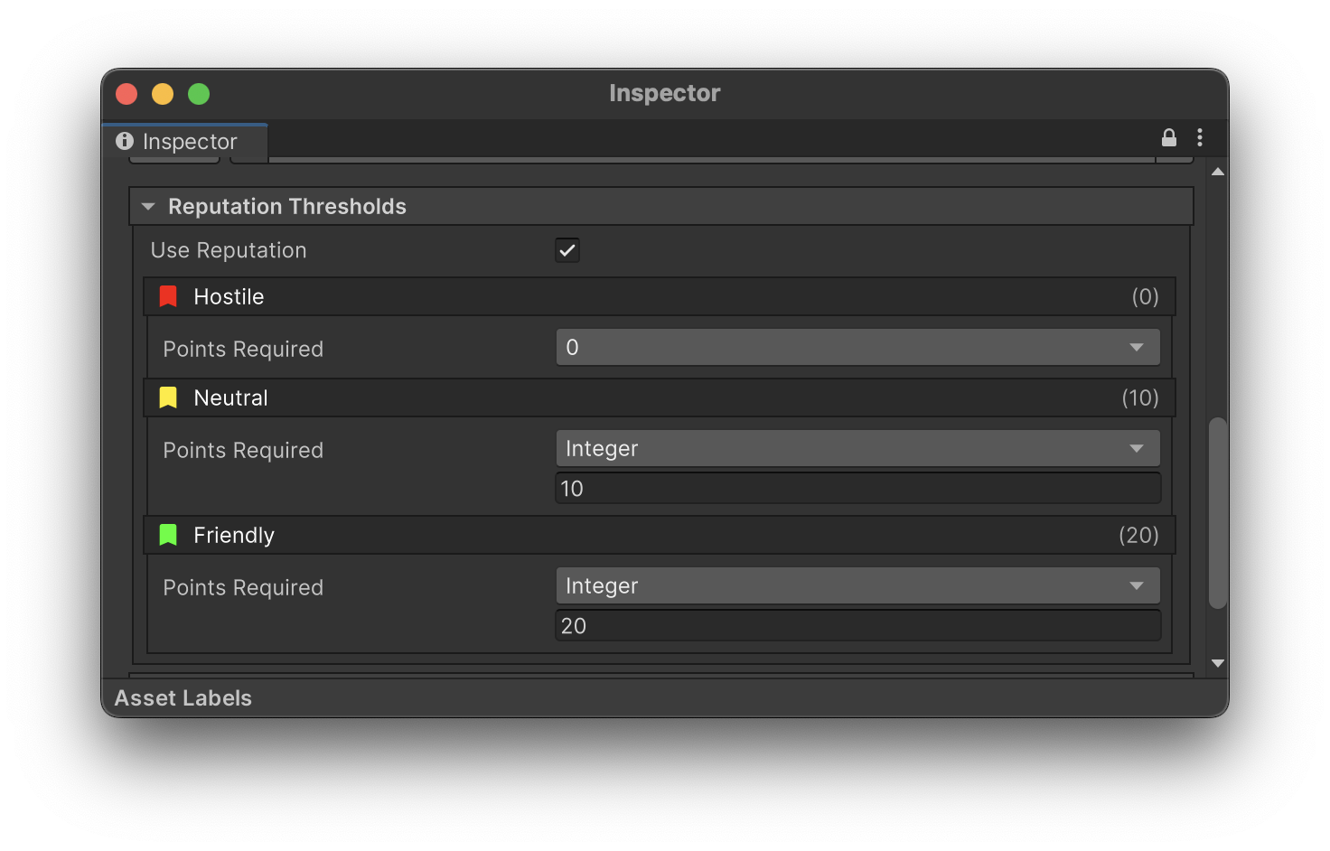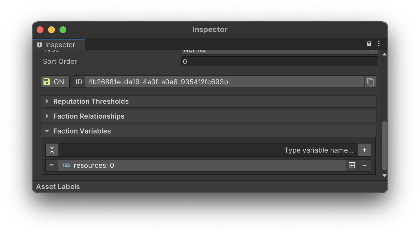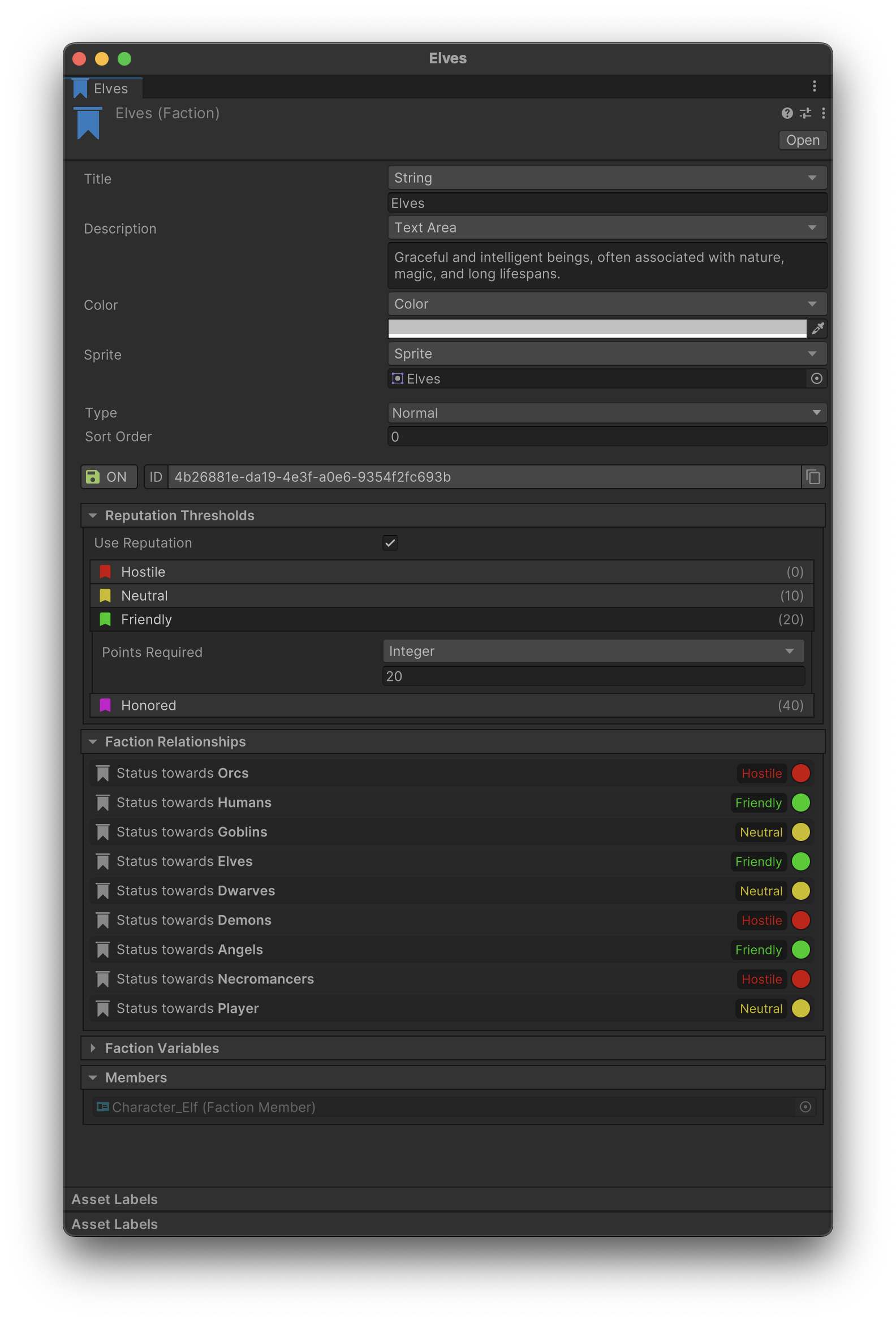 The **Faction** asset defines the various factions within your game. It includes settings for reputation thresholds, relationships with other factions, and custom variables.