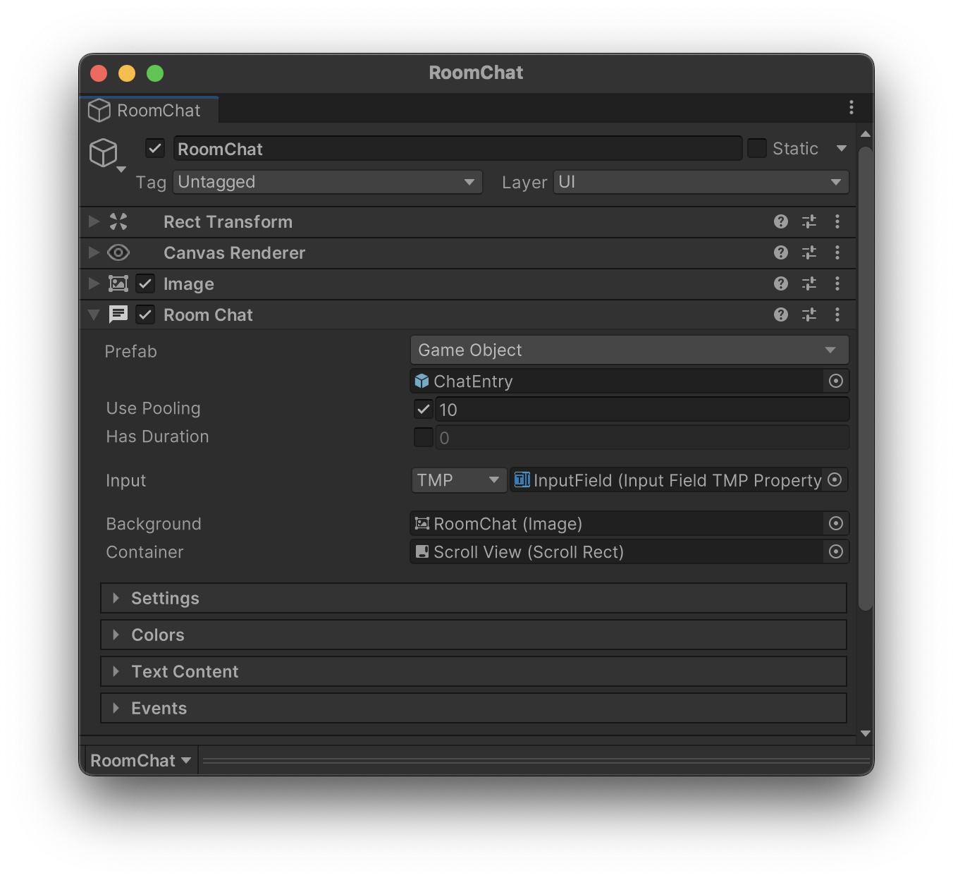 The Room Chat component is designed to facilitate real-time communication between players within a game session. It offers various customizable options to enhance the chat experience, ensuring smooth interaction and a polished user interface.