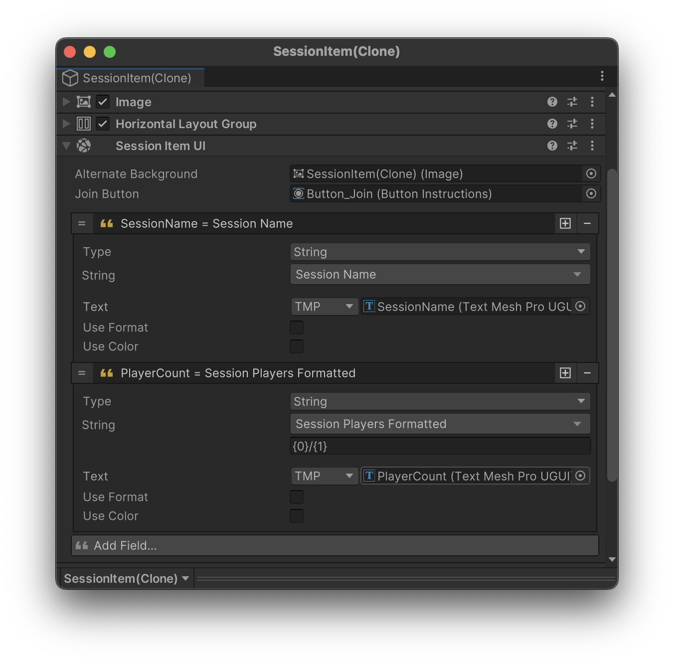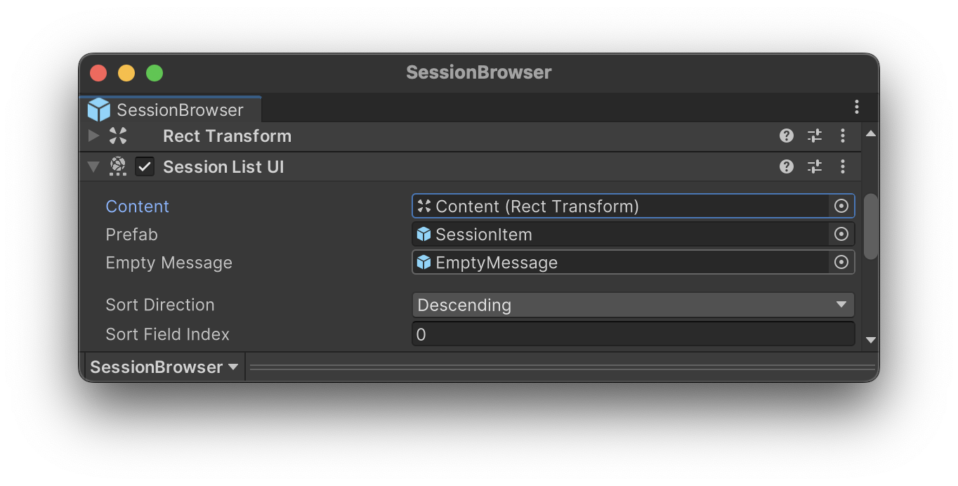 The Prefab is the prefab instantiated inside the Content. It must contain a Session Item UI component, which is automatically configured by its parent.