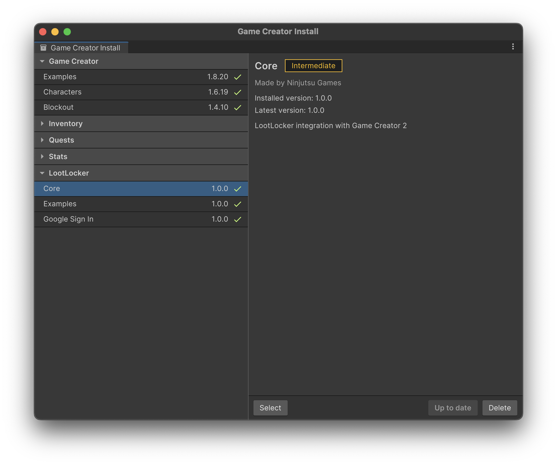 After importing LootLocker module head to the Game Creator Install window and install the Core package.