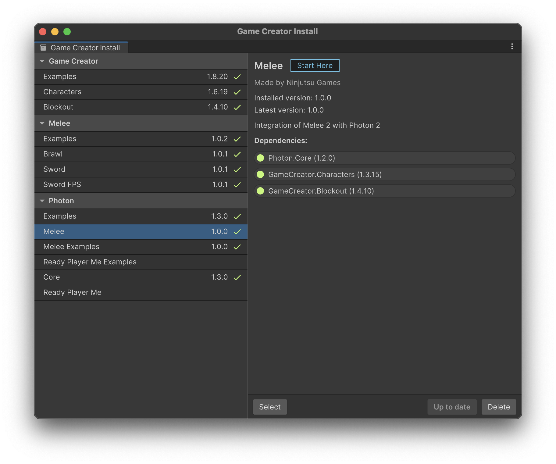 Finally bring up the ***Game Creator Install Window*** select the [**Photon Melee 2**](https://u3d.as/359g) package and install it.