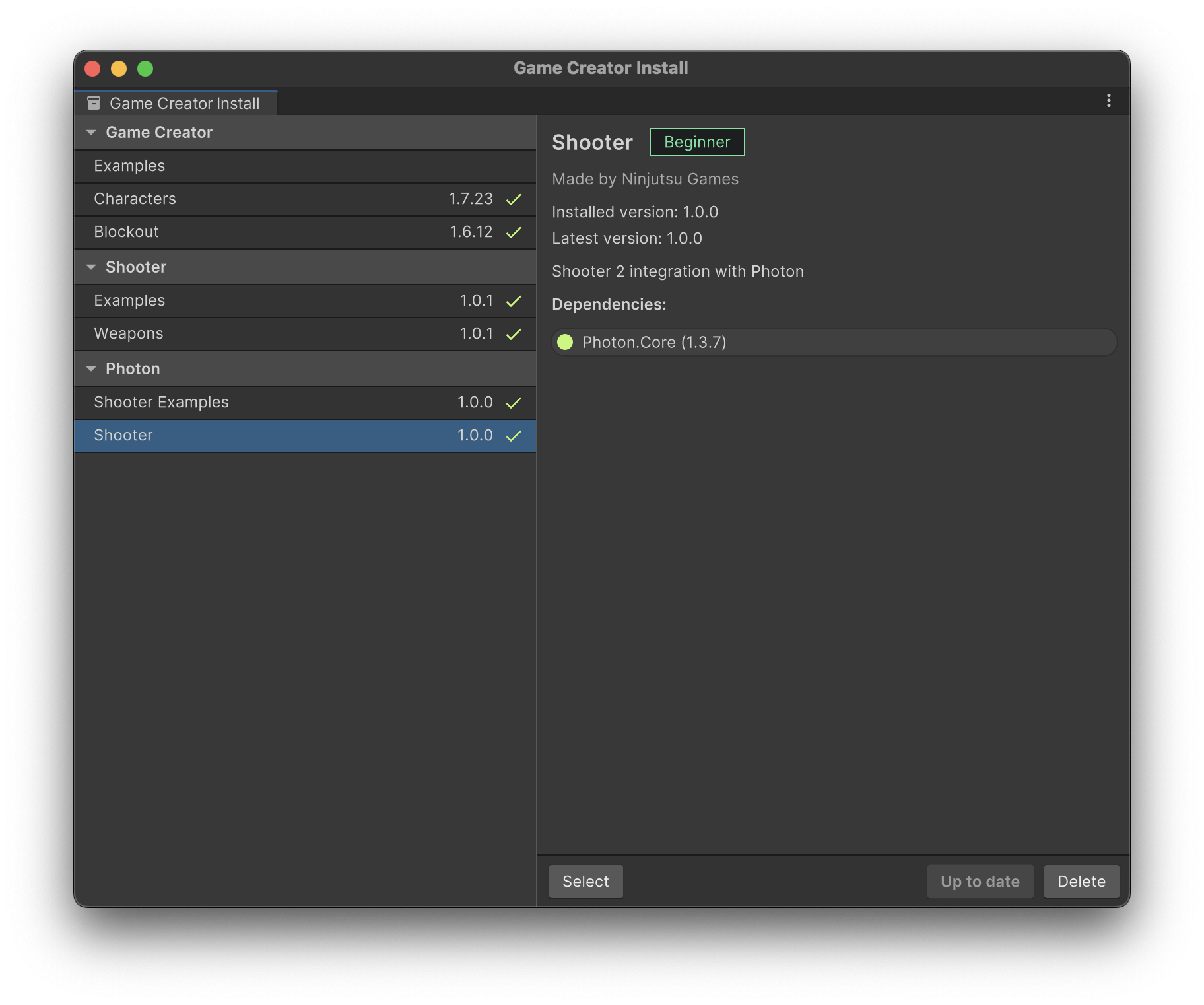 Finally bring up the ***Game Creator Install Window*** select the **Photon Shooter 2** package and install it.