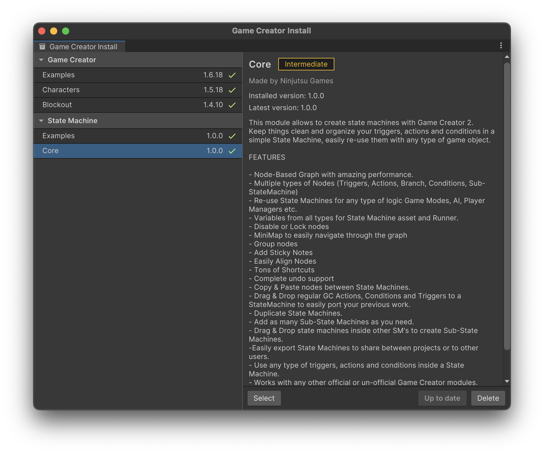 Finally bring up the ***Game Creator Install Window*** select the **State Machine 2** package and install it.