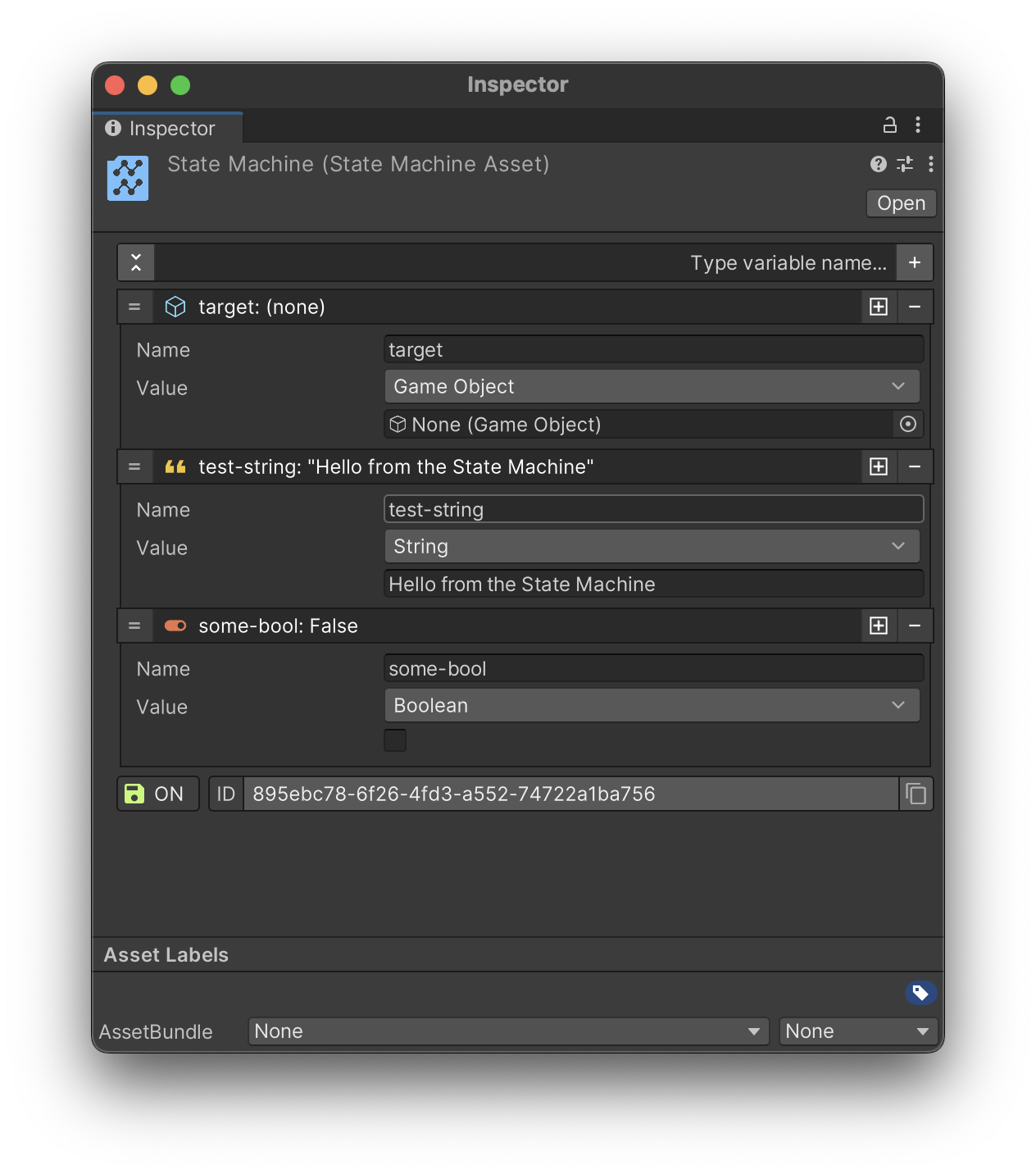 All variables can be created from the State Machine Asset, State Machine Runner, or the Blackboard in the Graph Editor.